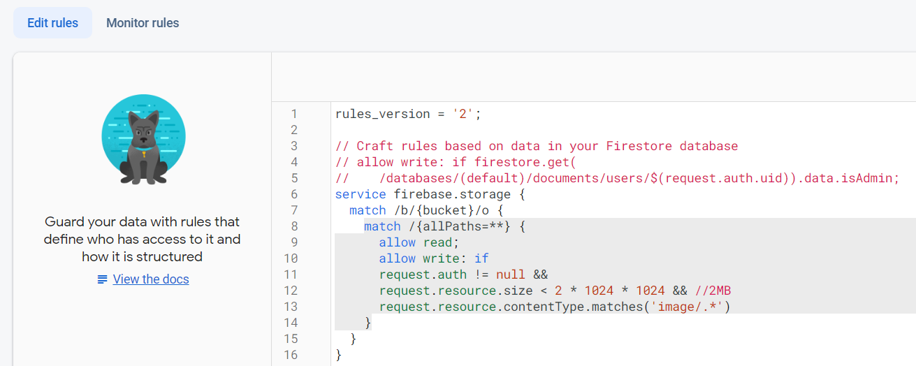 예를 들어, 로그인한 유저만 파일업로드가 가능하고 사이즈와 타입의 제한이 있는 경우 아래와 같이 규칙을 수정합니다.