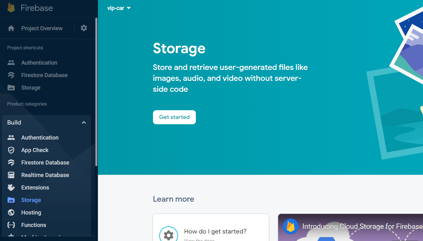계정으로 로그인한 뒤 좌측 메뉴에서 'Build' -> 'Storage' 선택 후 열린 화면에서 'Get started'를 누릅니다.