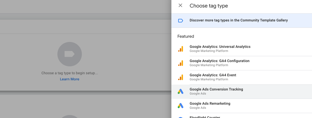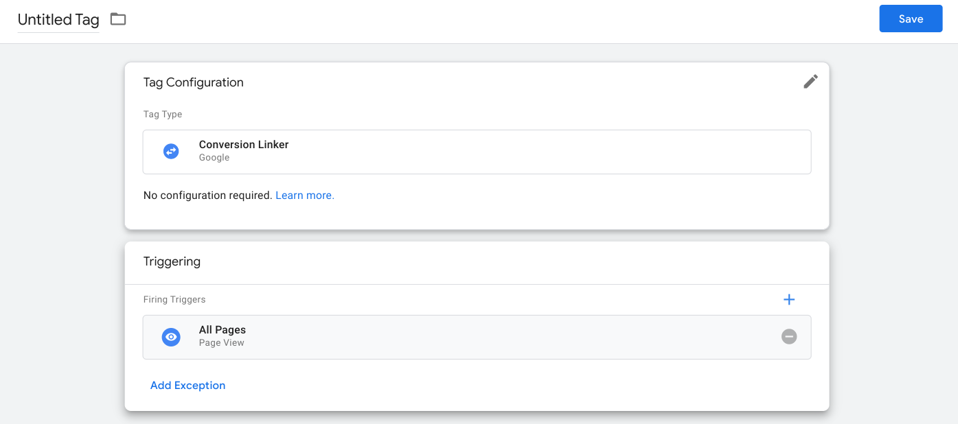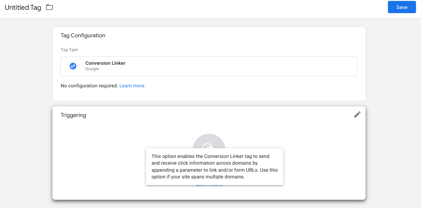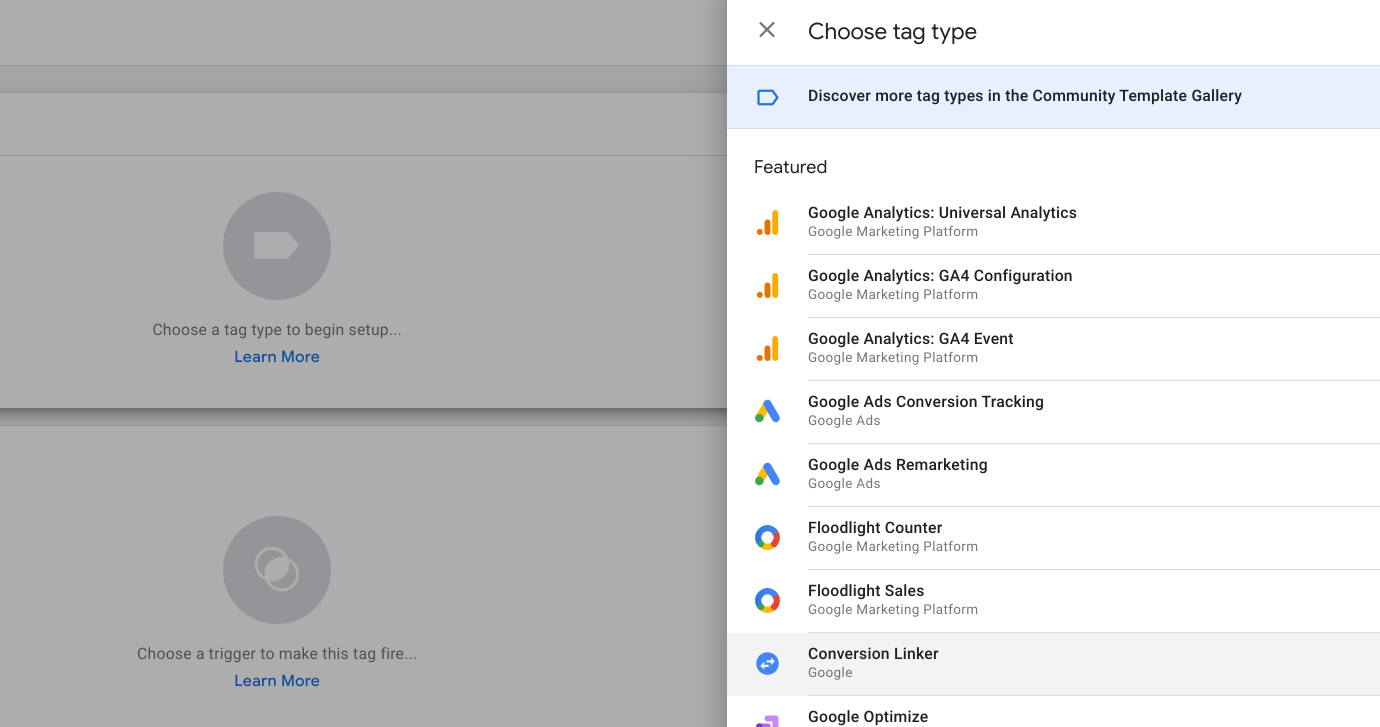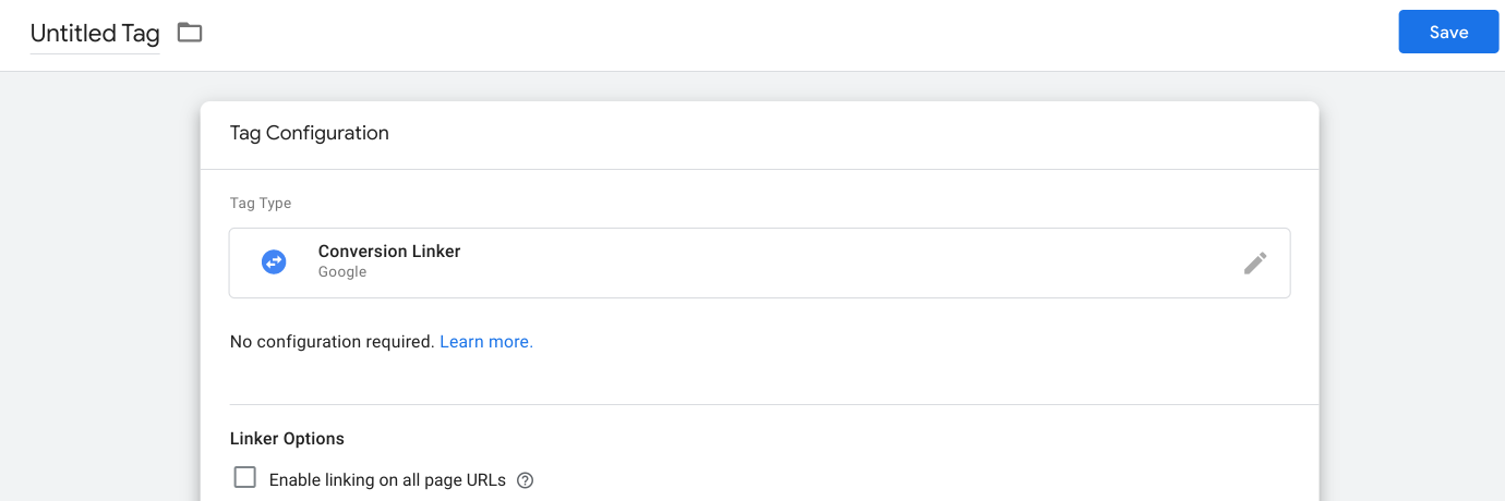 Conversion linker is a tag that improves the accuracy of conversions. One conversion linker is shared throughout all the conversions. You can either create one directly or as part of setting a conversion up. Since setting it up as part of setting a conversion comes with all the configuration, we will go with the latter first.