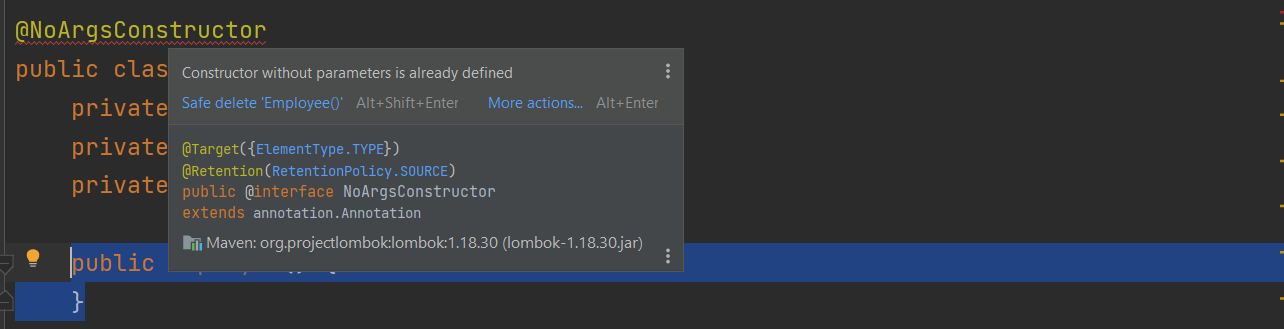 실제 생성되는지 여부는 매개변수 없는 생성기를 그대로 둔 상태에서 @NoArgsConstructor 어노테이션을 추가하면 아래와 오류 메시지를 통해 가능합니다.