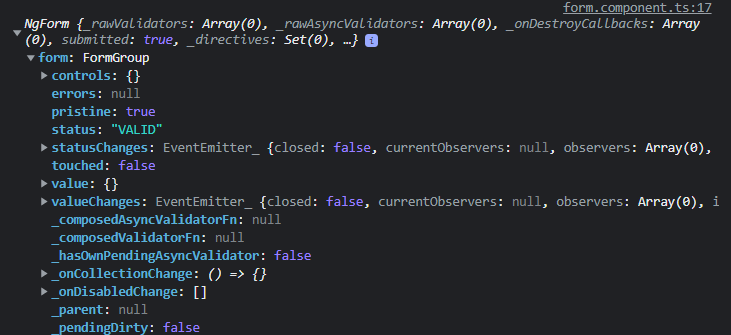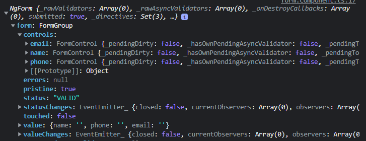 Let's submit the form to see what is inside. controls represents each input in the form. Even though we can see the form with various values we can use such as value, status, errors, touched, you will see an empty object as no controls are linked to the form yet.