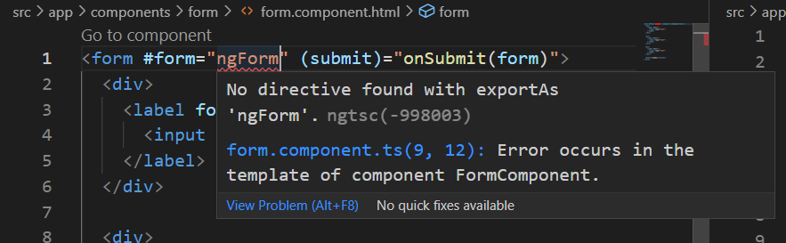In the class file, add a function (onSbumit()) with a parameter. The type of the parameter is 'NgForm' from the forms module