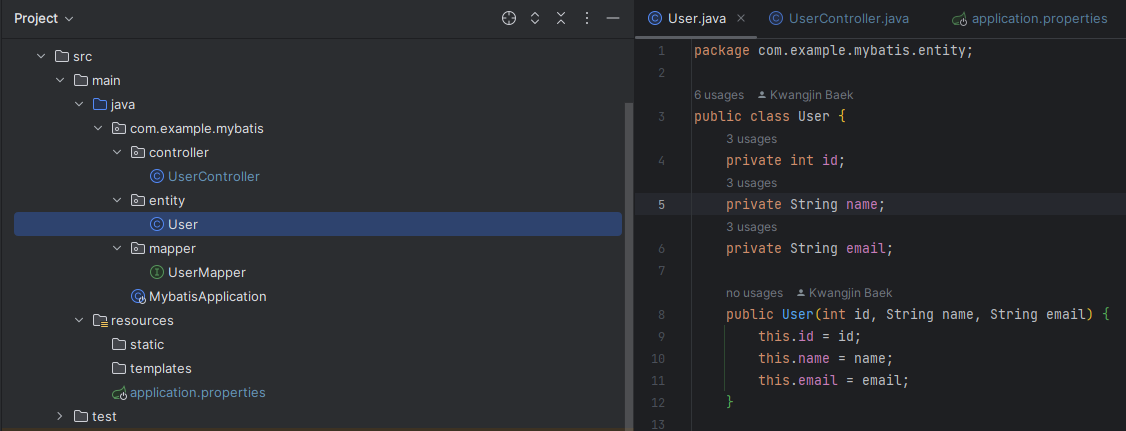 Create an entity package and add a class. Add a constructor, getters, and setters. With Mybatis, we don't need to add an annotation for mapping, it will be automatically mapped.