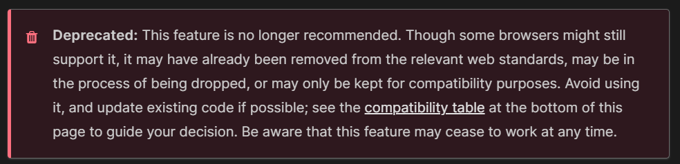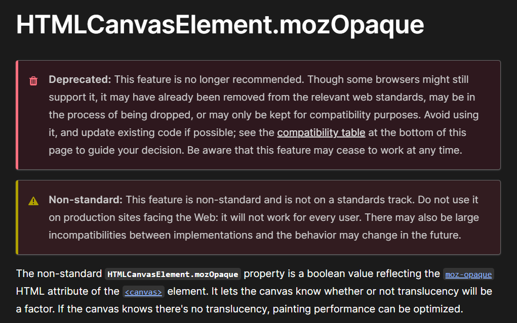 For example, among the HTML canvas attributes, there is an attribute called 'mozOpaque' which controls the opacity of the element. But because of its limitation of only being able to be used on certain browsers and the advent of other ways to do the same thing for all browsers, it was deprecated. Deprecated codes show a message that they are deprecated with a replacement code that can be used instead.