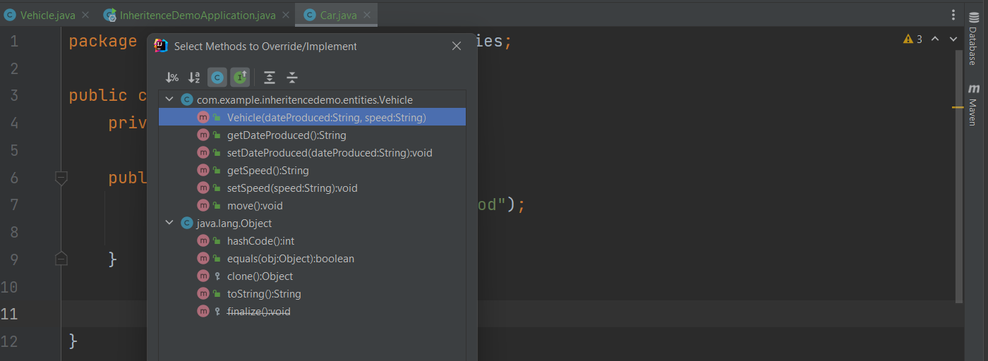 A child can override the method of its parent. Click Ctrl + O to display the list of the inherited methods