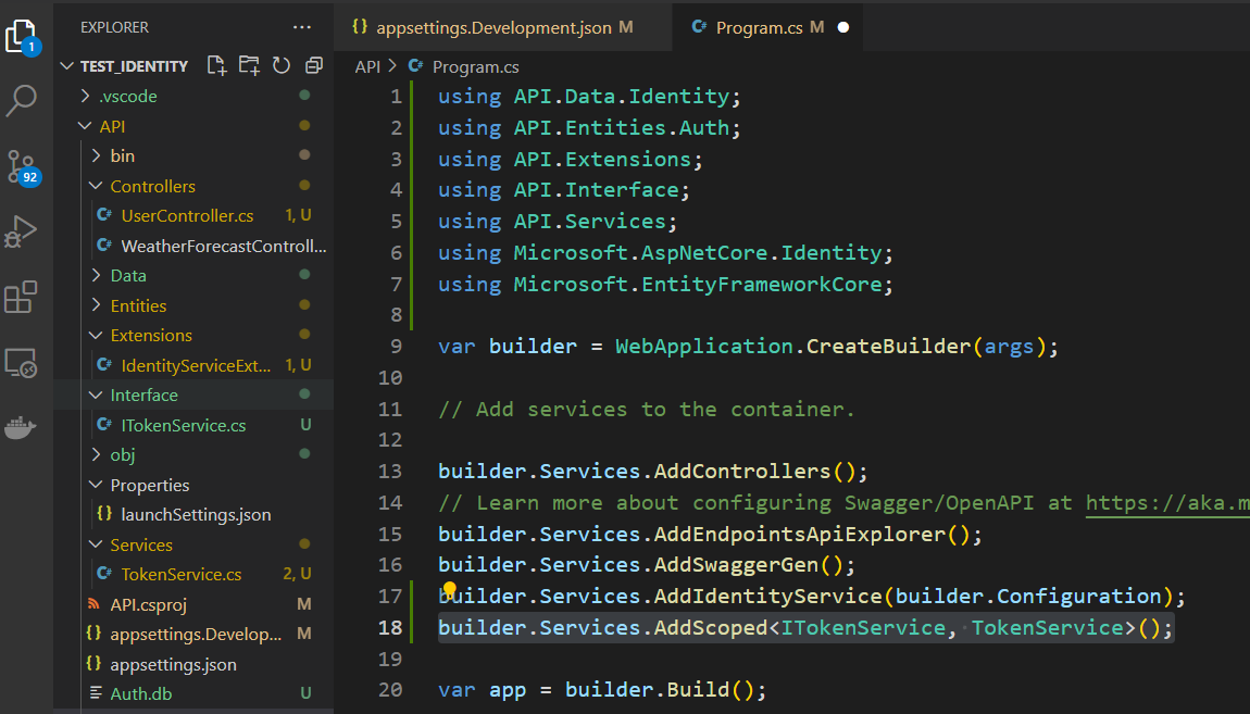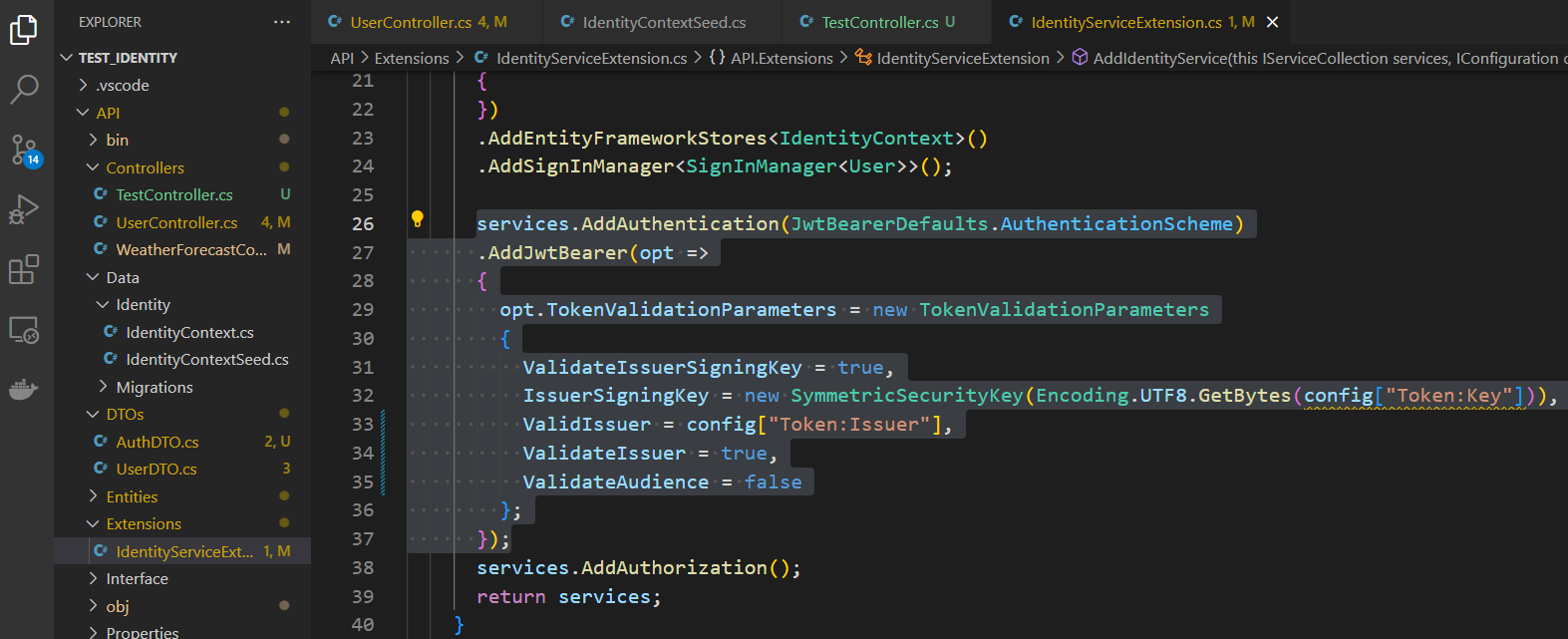Go to the identity service extension class and add the code shown below