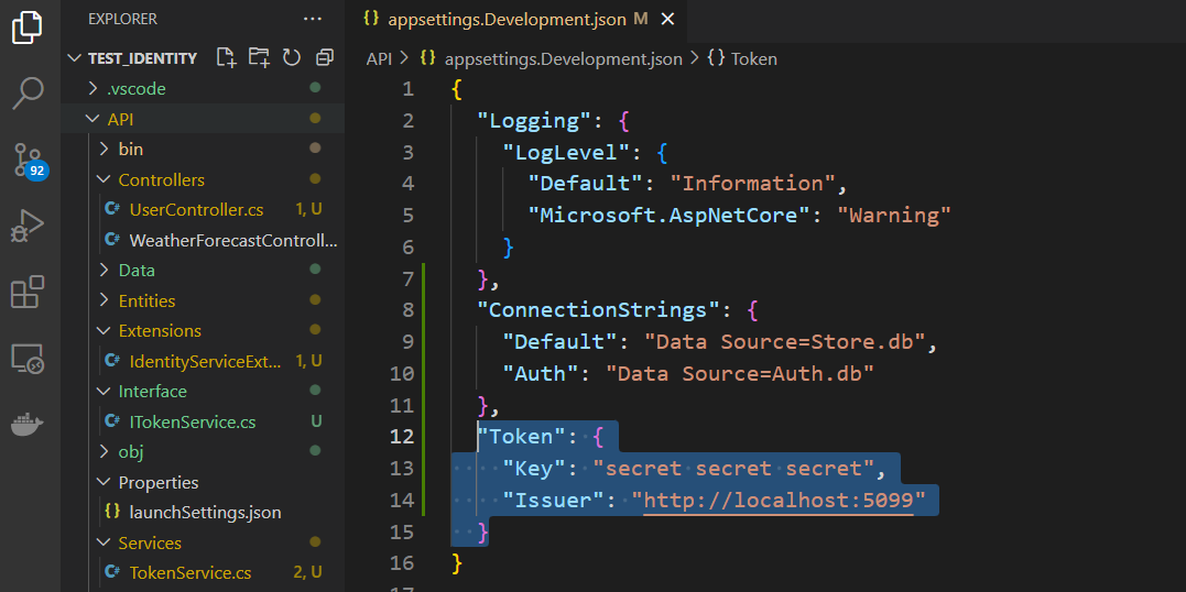 Go to the 'appsettings' file and add a environment variable that contains the key and the issuer. Note that the value for the key should be 12 charaters and more