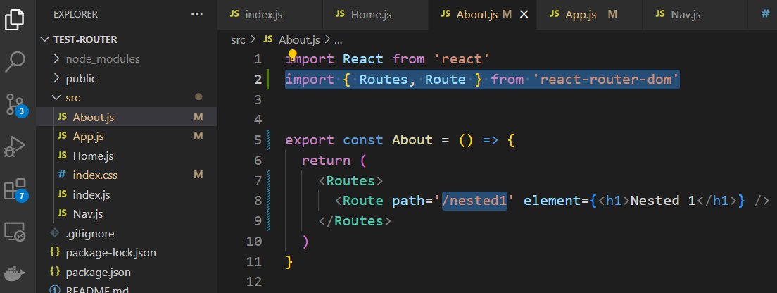 Import the library to the component. We need 'BrowserRouter', 'Routes', and 'Route'